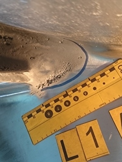 The following photos 1-6 illustrate the repair of the crack defect on a pelton-type runner where the blade is broken. The reconstruction of the split part of the blade with the body of the runner was carried out without disassembly, on the site.